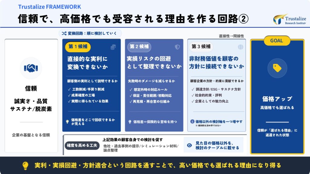 信頼は、それだけでは価格アップにはなりません。しかし、実利、実損回避、方針への適合といった点を通して整理されると、「それでも買うべき理由」として意味を持ち始めます。信頼と高価格との間の変換を、具体的ロジックをもって積み上げていくのが、信頼から実利を得るためのカギといえるでしょう。